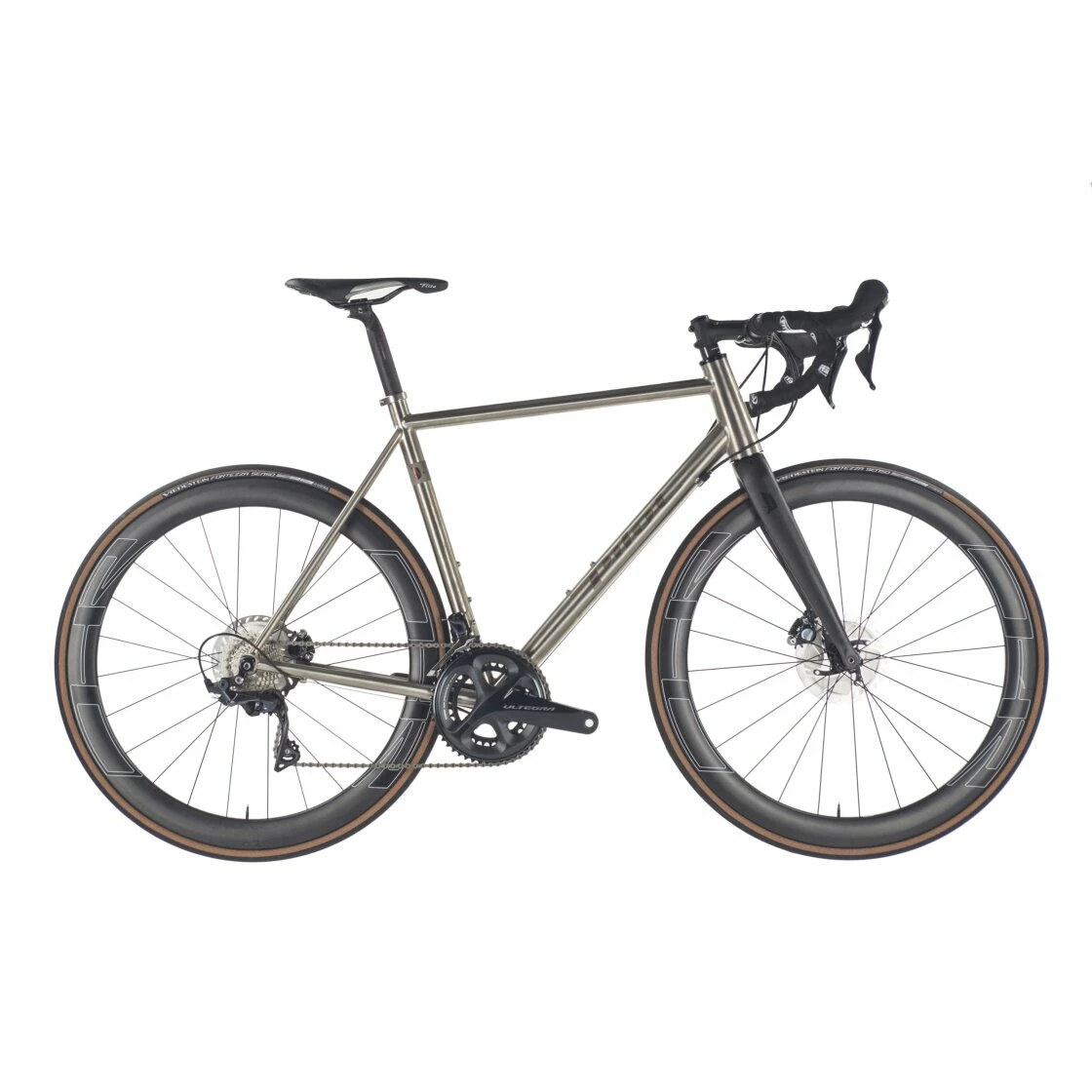 Aerospace grade 5 and grade 9 db titanium 142 x 12 thru axle CNC drop outs Tapered internal head tube Flatmount disc brake Tire size max 28mm Hydro formed tubing Internal brake hose Double butted tubing T47 bottom bracket Hand-brushed finish