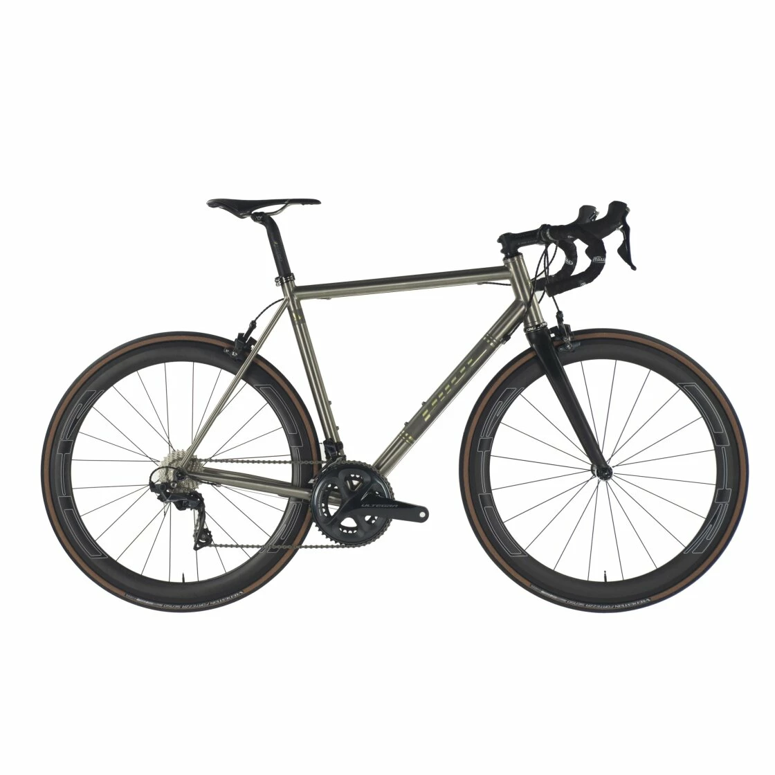 Aerospace grade 5 and grade 9 db titanium Quick release CNC drop outs ZS44 Head Tube Tire size max 28mm Hydro formed tubing Double butted tubing BSA bottom bracket Hand-brushed finish