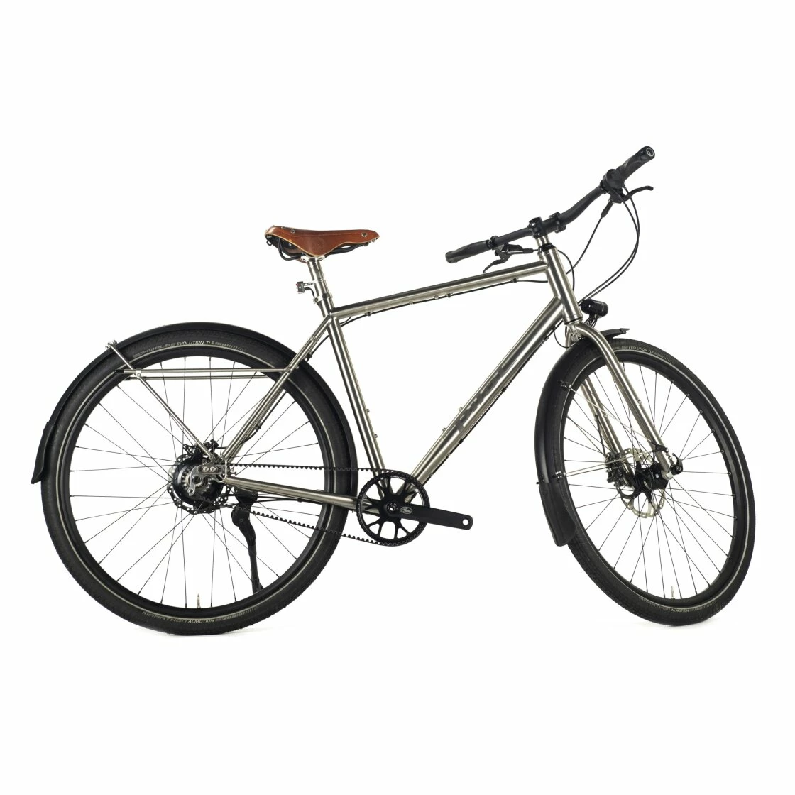 Aerospace grade 5 and grade 9 db titanium Hydro formed tubing ZS44 head tube Rohloff specific CNC sliding drop out 142 x 12 thru axle cnc drop outs Postmount brake on dropout Tire size max 55mm Hand-brushed finish Oversized chain stays